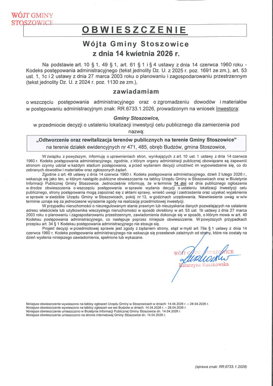 Obwieszczenie Wójta Gminy Stoszowice z dnia 14 kwietnia 2026 r. o wszczęciu postępowania administracyjnego oraz zgromadzenia dowodów i materiałów w postępowaniu administracyjnym znak RR.6733.1.2026