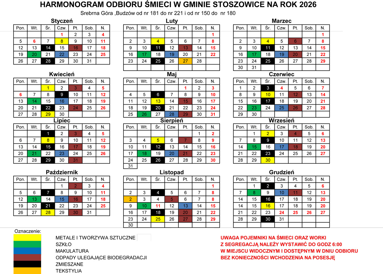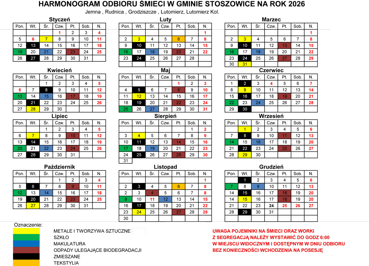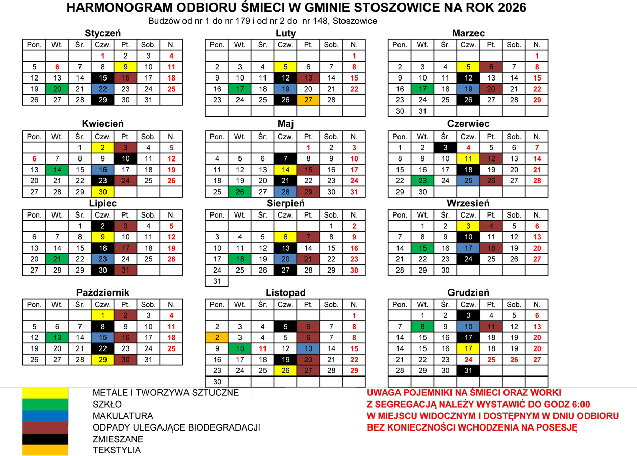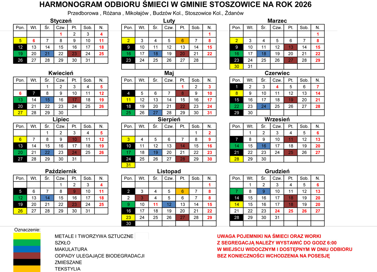 Informacja o harmonogramie wywozu odpadów selektywnych i zmieszanych w gminie Stoszowice w 2026r.